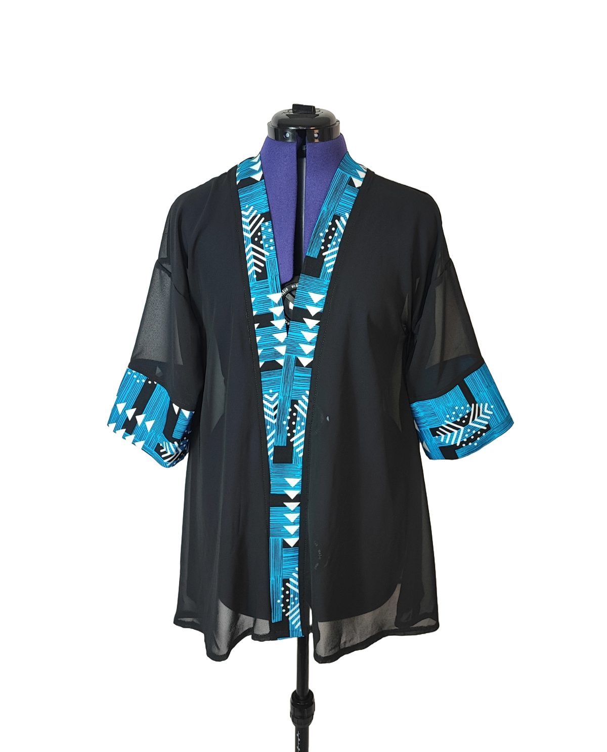 <p>Description </p><ul><li>Kimono en mousseline</li><li>Manches 3/4</li><li>Bordures et poignet en tissu Bogolan</li><li>Longueur maximale : 100 cm</li></ul><p> </p><p>Entretien</p><ul><li>Lavable en machine à 30°</li></ul><p> </p><p>Fabrication à la demande sur mesure et personnalisable.</p><p> Contactez la créatrice (rubrique “SUR MESURE”)</p>